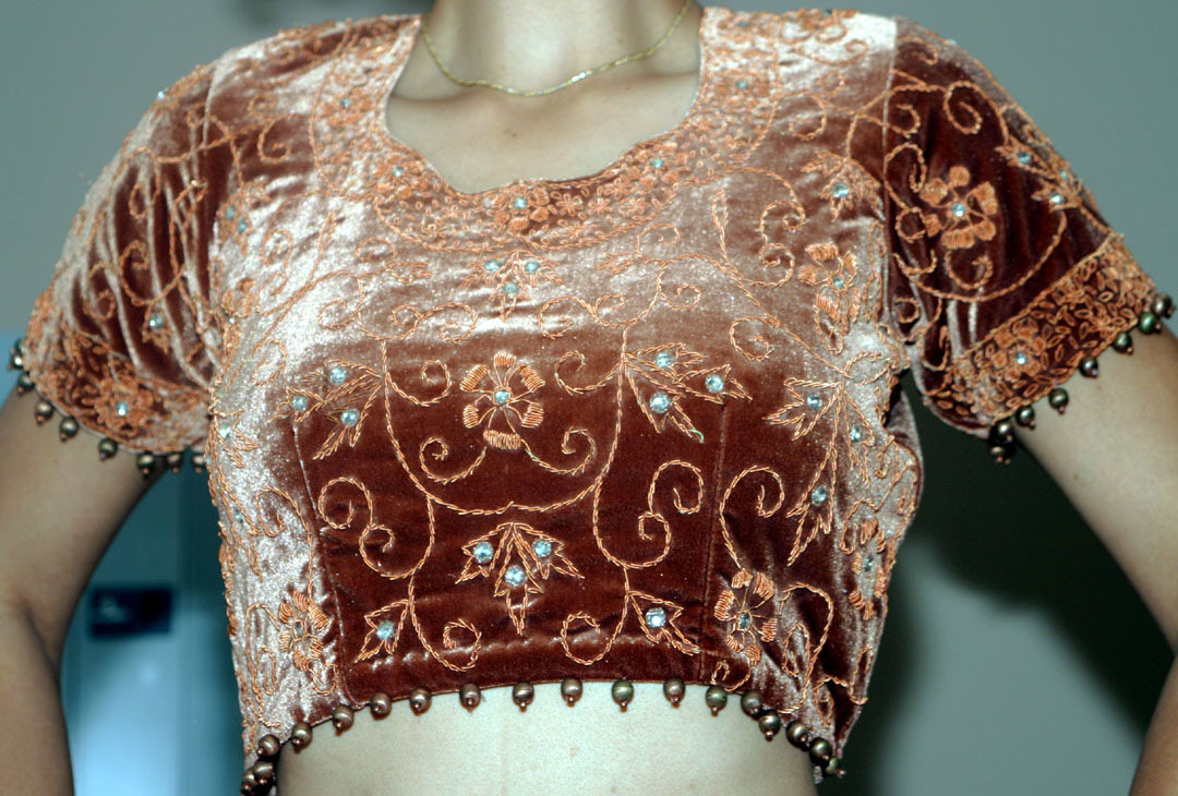 Short, midriff-baring velvet "choli" top with metallic embroidery on the front. Bronze beads decorate the sleeves and hem, hook and eye closures in the back. Size medium.