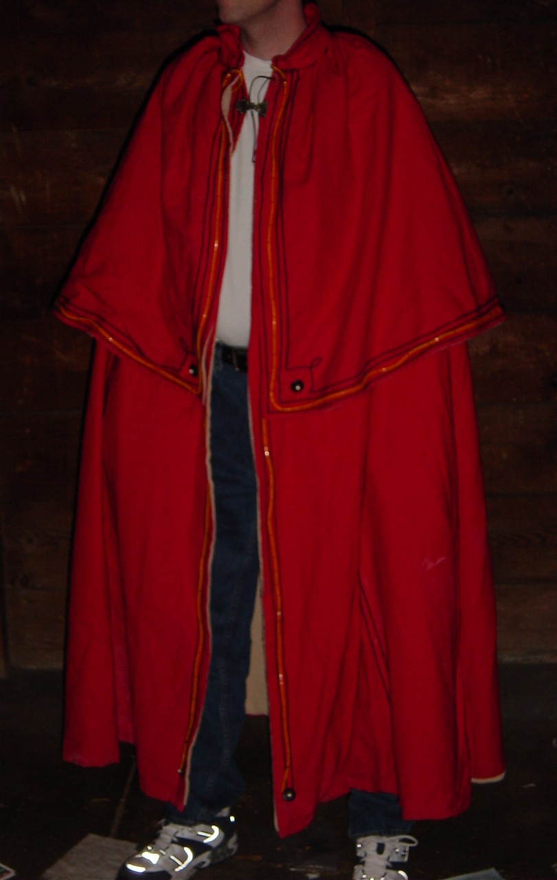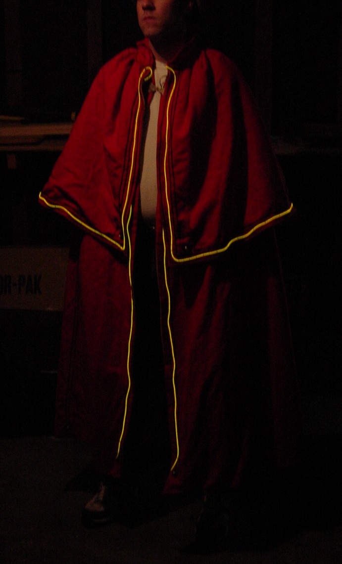 This cloak is red with black trim and it has also been detailed with almost 20 feet of yellow phat EL wire outlining the cloak's edge. Great for cold playa nights, will certainly keep you warm. Looks fabulous during the day and at even better at night!
